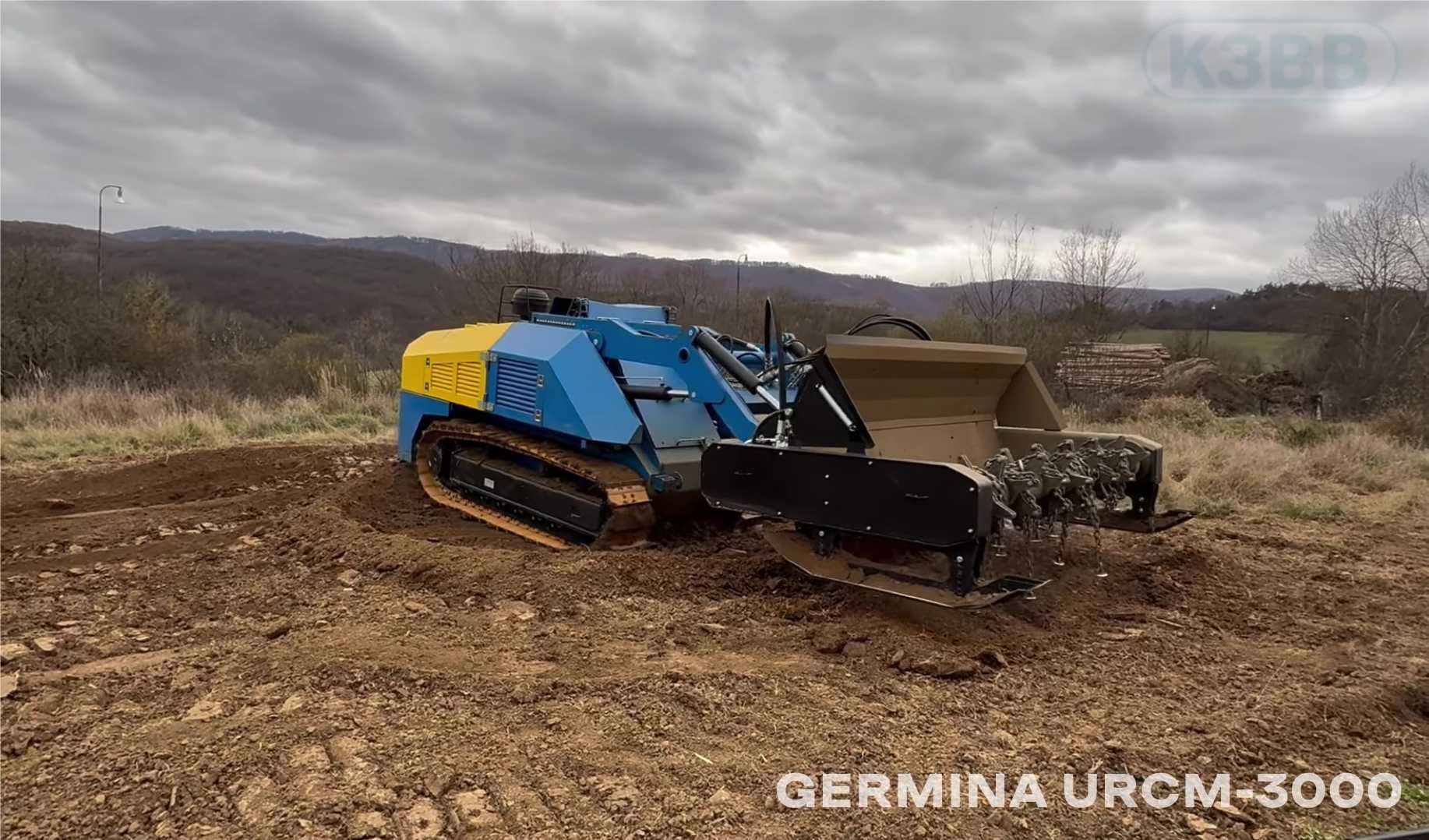The Germina URCM-3000 is a 16-ton remote-controlled system with blast resistance rated at up to 9 kilograms of TNT. It is equipped with a working mechanism consisting of chains with detonating hammers, capable of neutralizing 75% of explosive devices and detonating an additional 15%. The standard configuration includes a universal bucket for safe soil displacement, trench clearing, and the construction of passages. Additional tools include a cutter, manipulator, and a multifunctional bucket, enabling effective operation in fields, forests, trenches, buildings, and fortified positions.