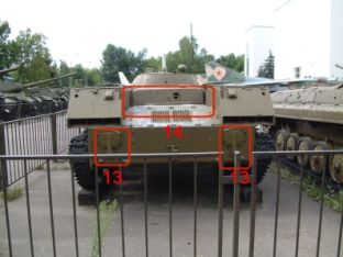 8. Gros épiscope sur l'avant gauche du toit de la tourelle. 9. Emplacement pour un homme d'équipage à l'avant gauche et droit de la base de la tourelle. 10. Cinq roues de route 11. Quatre galets supports, le 1° et le 4° sont placés vers l'intérieur du train de roulement. 12. Quatre galets supports, le 3° et le 4° sont placés vers l'extérieur du train de roulement. 13. Un hydrojet à l'arrière gauche et droit de la coque. 14. Le centre de l'arrière de la coque est plus bas par rapport aux flancs du véhicule.