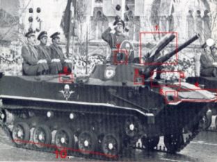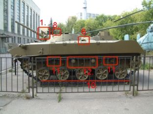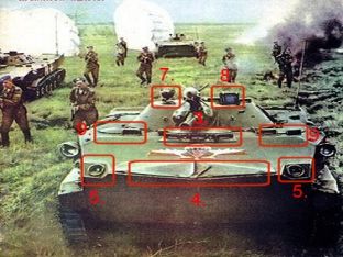 1. Rampe pour missile Sagger au-dessus du canon 2. Episcopes à l'avant gauche et droit de la coque. 3. Emplacement du chauffeur à la base de la tourelle, au centre de l'avant de la coque. 4. Plaque pare vague sur la partie supérieure de l'avant de la coque. 5. Emplacement de mitrailleuse à l'avant gauche et droit de la coque. 6. Un épiscope sur le toit, à l'arrière gauche et droit de la base de la tourelle. 7. Phare de vision nocturne sur le côté droit du toit de la tourelle. a
