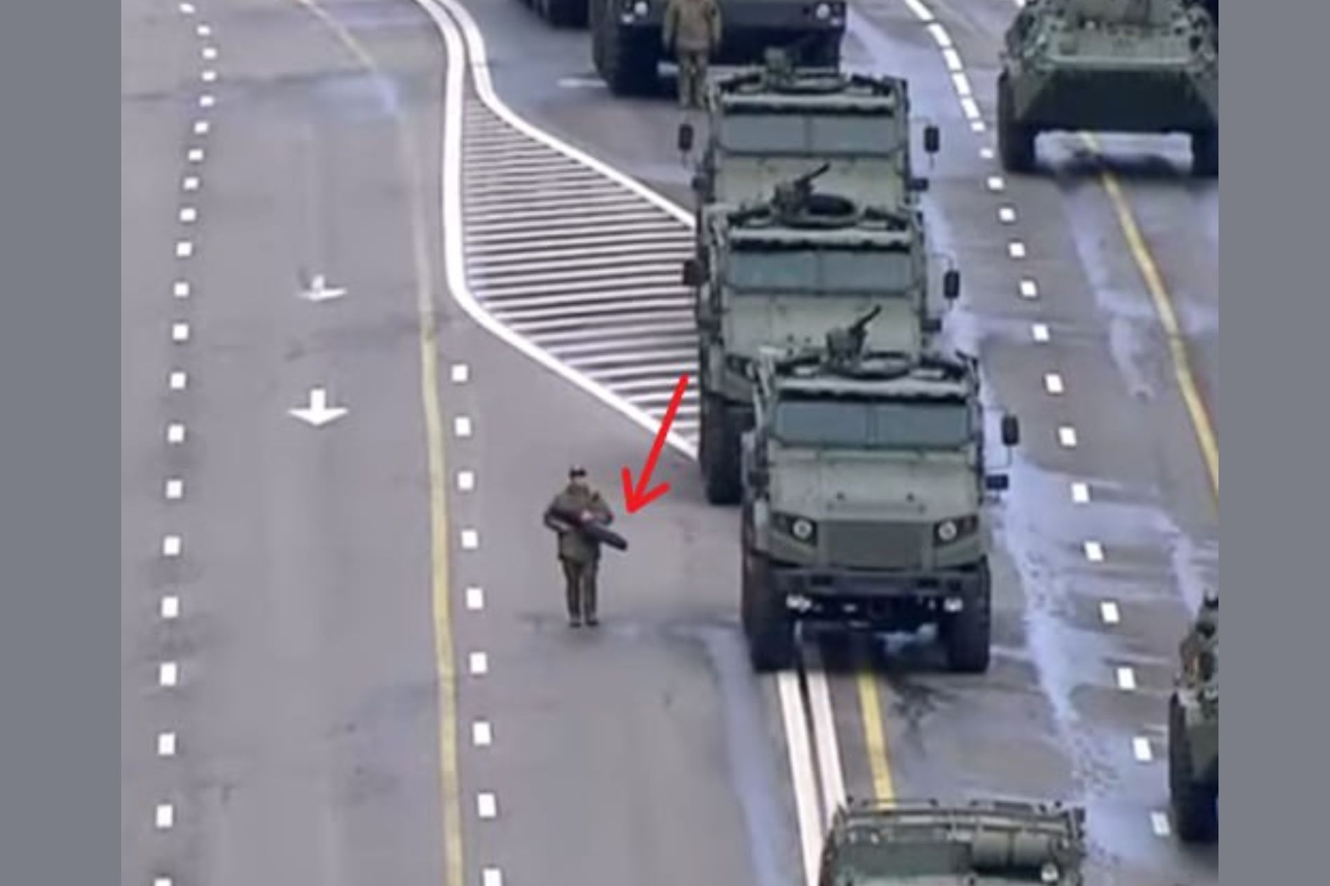 Russian soldier spotted during 9th May parade with an Anti-drone rifle ( directed Jammer) (Picture source: Telegram channel )