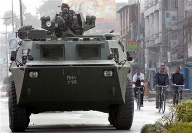 Nepali soldiers with wheeled armoured vehicles WZ 551 keeping