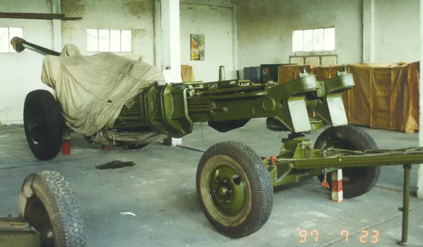 en V, avec un avant-train à deux roues. Le M-46 est servi