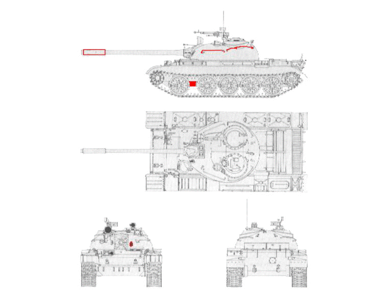 en forme de poêle renversée. Barres de maintien droites à l'avant et arrondies à l'arrière. Système de visée ovale à gauche du canon. Un gros phare IR est placé à droite du canon, légèrement décalé vers le haut. L'écoutille de droite est légèrement bombée. Un petit phare à lumière blanche est placée devant l'écoutille de gauche.