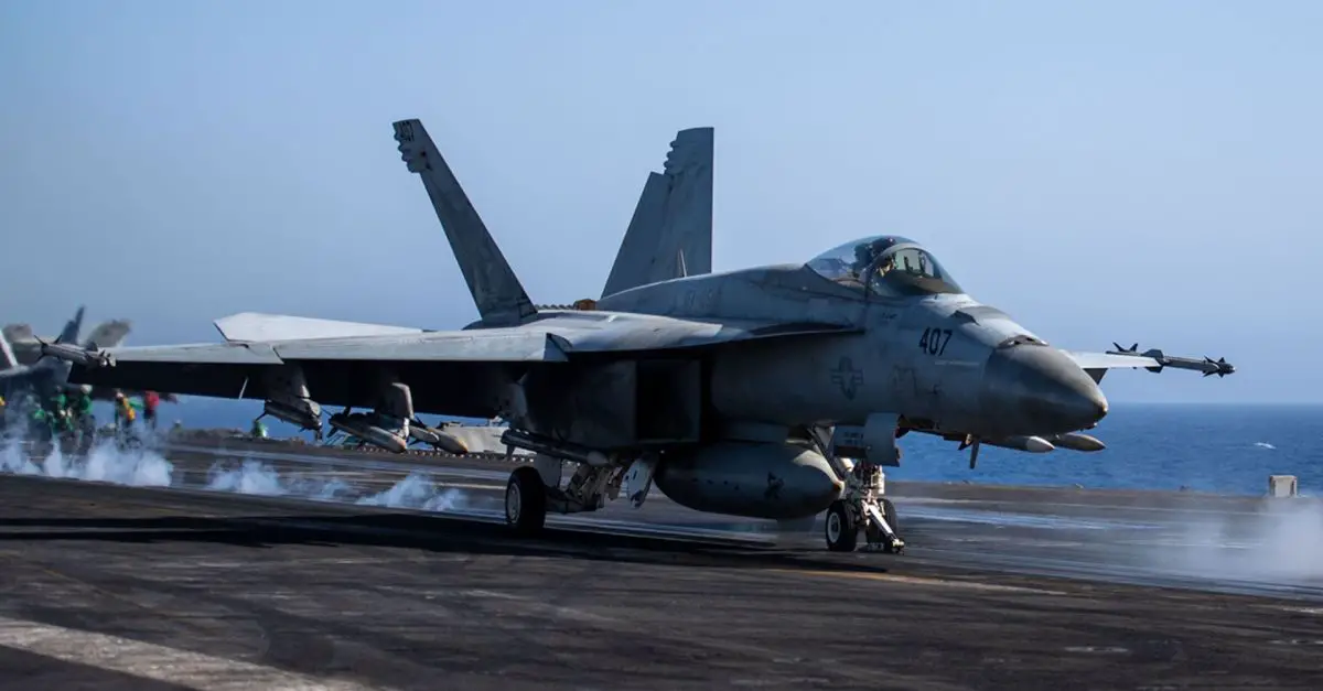 An F/A-18E Super Hornet, attached to the "Gunslingers" of Strike Fighter Squadron (VFA) 105, aboard the Nimitz-class aircraft carrier USS Dwight D. Eisenhower (CVN 69) in the Red Sea, April 20 (Picture source: U.S. DoD )