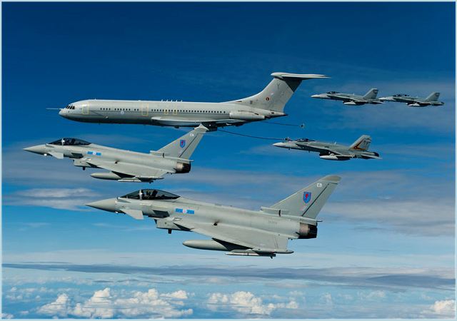 ![]() 6 Squadron Eurofighter Typhoons flying alongside aircraft refuelling from a 101 Squadron VC10 during Exercise Bersama Lima in Malaysia [British MOD Picture: Geoffrey Lee, Planefocus Limited 2011] |