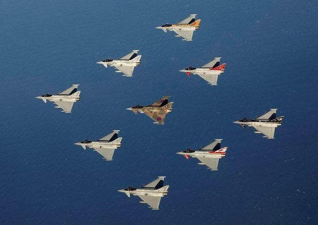 Pictured are all RAF operational and training assets represented in the sky with a Typhoon diamond 9 formation flight(Credit: UK MoD/Crown copyright) |