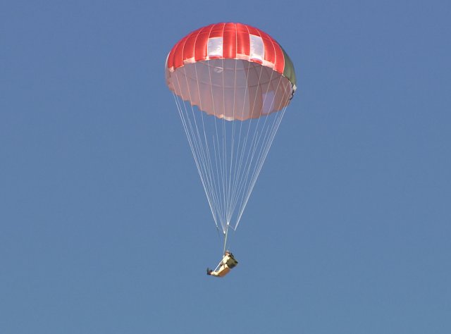 A GR7000 parachute along with dummy descends over a drop zone near Edwards Air Force Base, Calif. A team from the USAF 418th Flight Test Squadron conducted several drops using the parachute(Credit: U.S. Air Force photo/Brad White) |