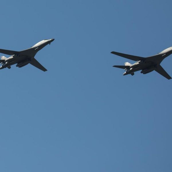 Two B-1B Lancers from the 28th Bomb Wing, Ellsworth Air Force Base, South Dakota, conducted a long-range strategic Bomber Task Force mission to the...