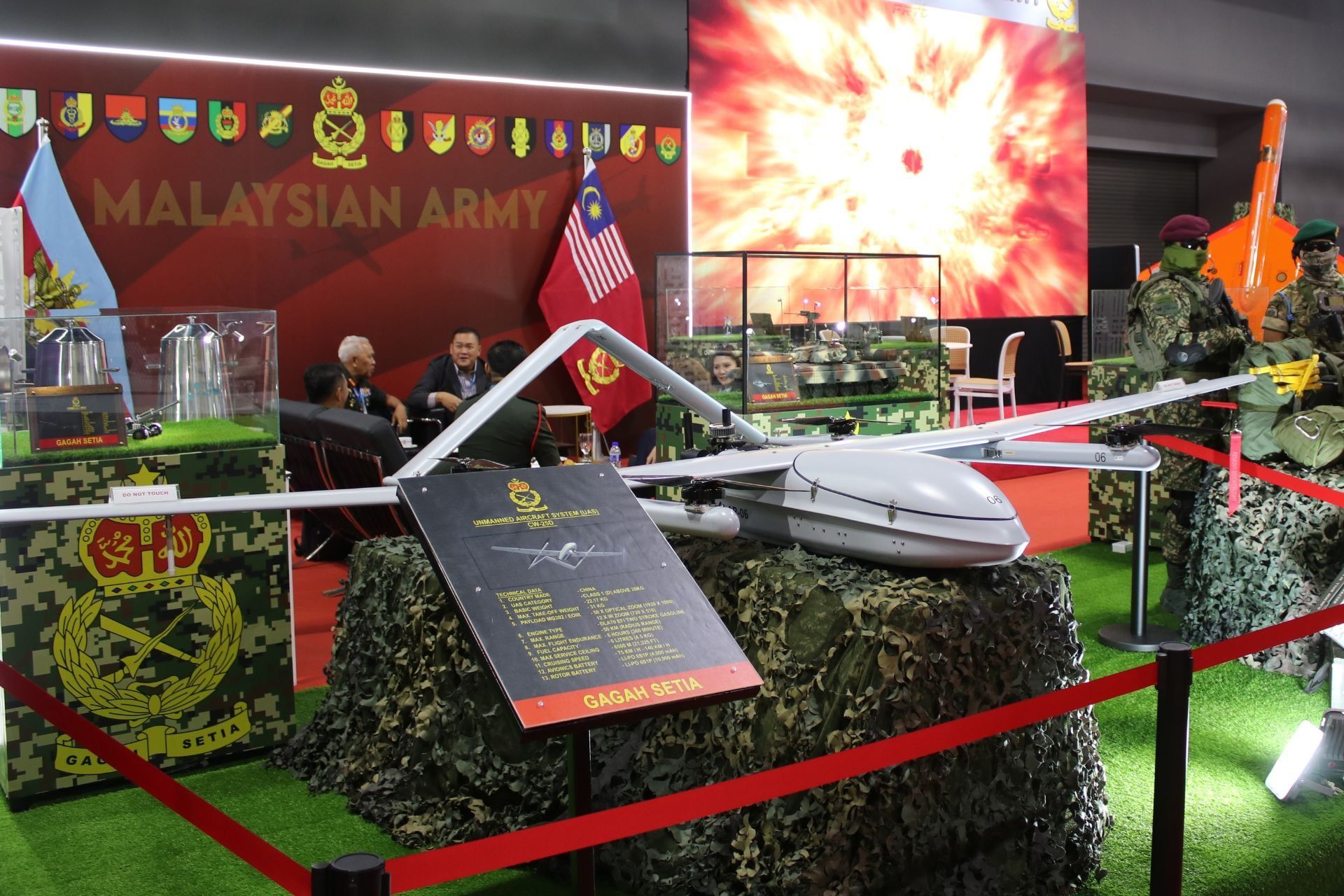 CW-25D tactical drone displayed on the Malaysian Army stand at DSA 2025 in Kuala Lumpur, highlighting its role in short-range ISR missions and integration within ground force surveillance capabilities (Picture source: Army Recognition)