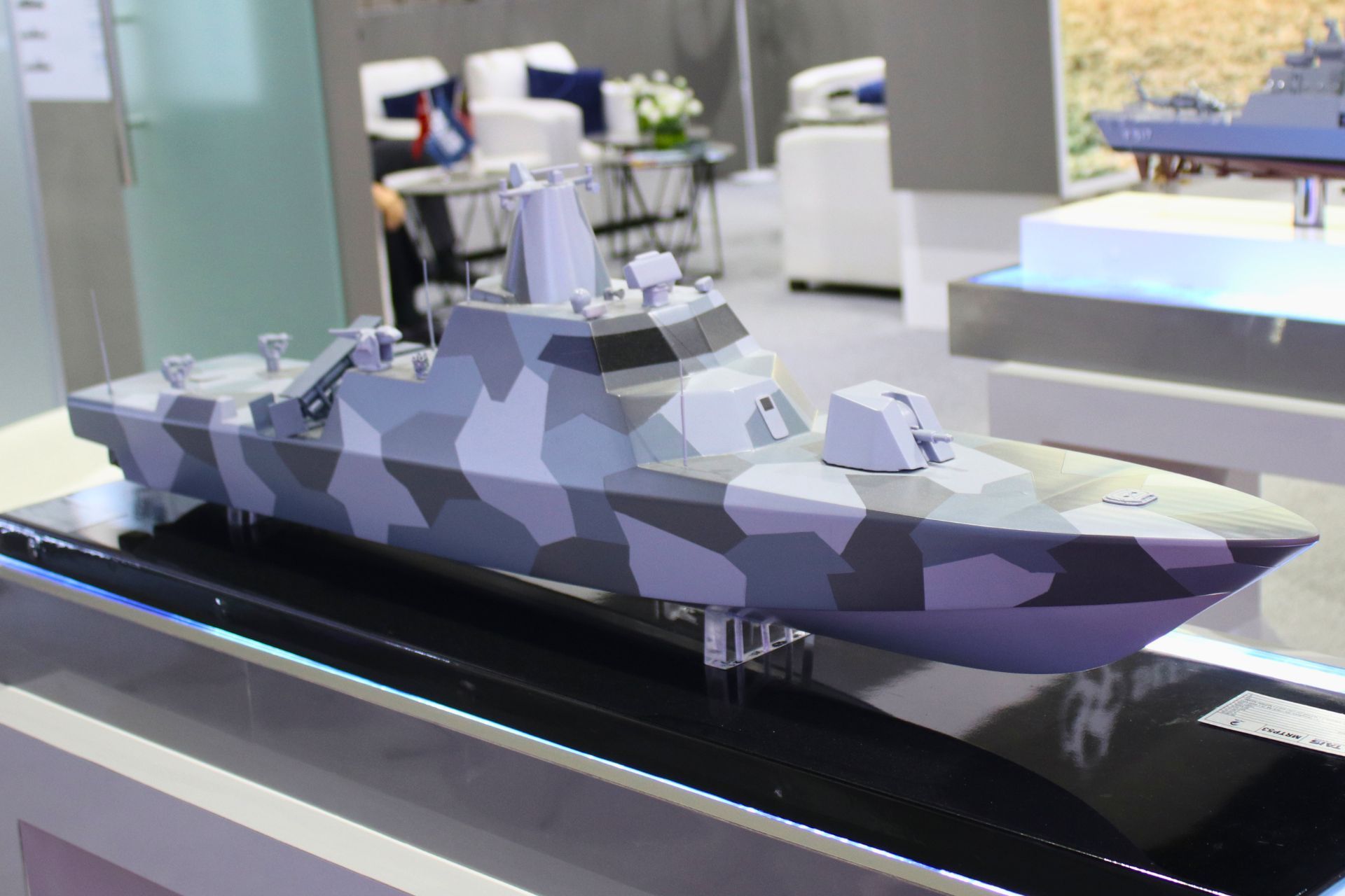 The MRTP-53 mock-up displayed by TAIS Shipyards at DSA 2026 in Malaysia shows this advanced-composites fast attack craft designed for high-speed littoral operations, with missile capability, a 76 mm gun, and an architecture intended for armed surveillance, maritime interdiction, and anti-surface warfare. (Picture source: Army Recognition)