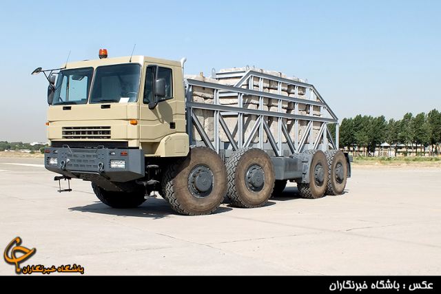 vehicle, dubbed Zafar, which Dehqan said has 4 separate drive axles. Zafar has also two steerable axles. It is equipped with anti-modern war systems, has an operational range of 800 kilometers and can carry loads up to 24 tons and pass steep slopes, deep waters and stair-like obstacles. The vehicle can carry various types of launchers, missiles, radars, rockets and command posts, the minister added. |