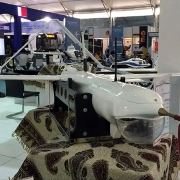 Both drones - "Yasir" and "Bina" - are displayed in the Iranian governmental institutions' booth during the Eurasia 2018 airshow which i...