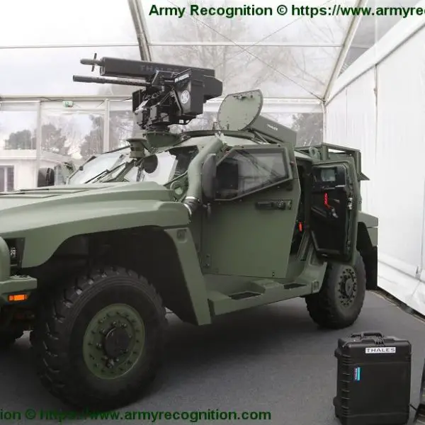 French Company Thales presents new pod of ground-to-ground 68mm rocket system mounted on FN Herstal remotely operated weapon system fitted on the r...