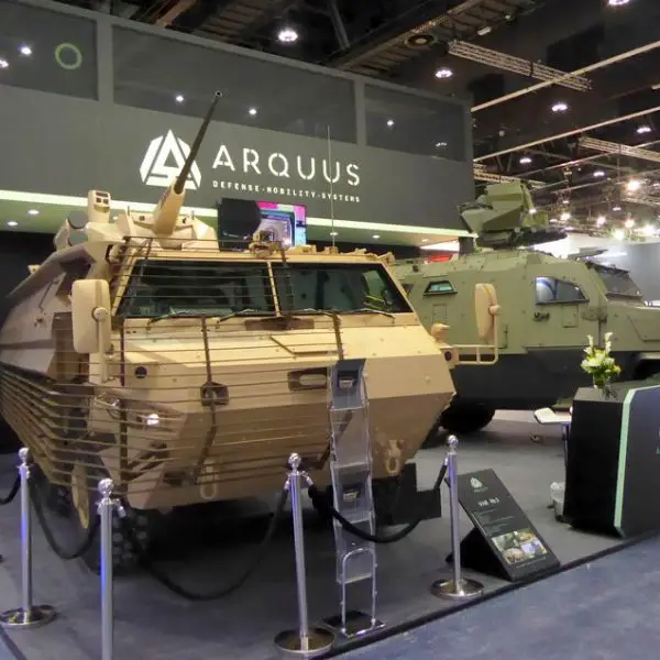 The French manufacturer Arquus is showcasing its VAB Mk.3 with its right flank fitted with the new over-armor designed to protect the vehicle again...