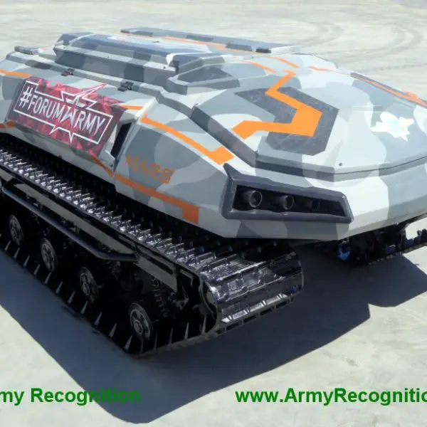 On their assigned area, the Russian airborne troops are displaying an unmanned ground vehicle manufactured by KB Avrora designated Mars A-800 but w...