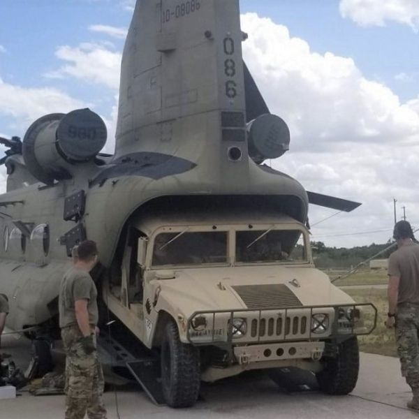 U.S. Army trains loading Humvee in CH-47 Chinook helicopter