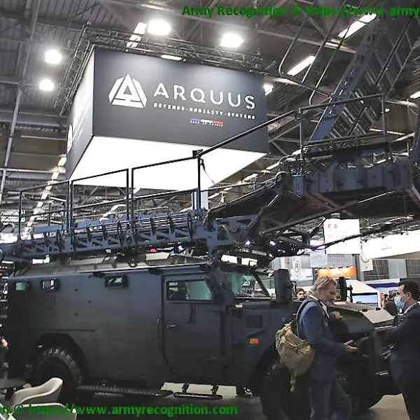 French company ARQUUS showcases its Sherpa APC (Armored Personnel Carrier) version fitted with assault ladders that can be used by police or securi...