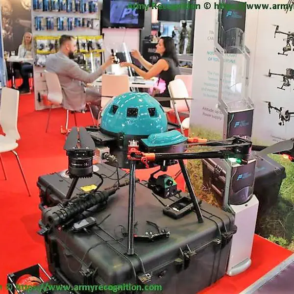 The Czech Company Free Horizons displays an armed version of its Argus Predator UAV (Unmanned Aerial Vehicle) fitted with a 40mm grenade launcher a...
