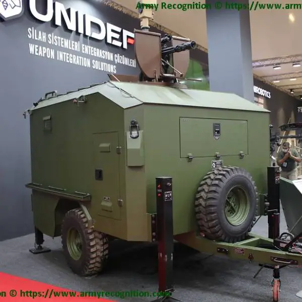 Turkish company UNIDEF a designer of gun mount weapon systems and interfaces for Land, air and Naval platforms presents its new armed trailer solut...