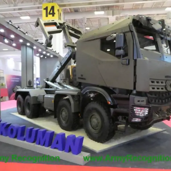 Turkish manufacturer and dealer Koluman Otomotiv Endüstri based in Tarsus displays, among other items, two 8x8 trucks fitted with an armored cab: a...