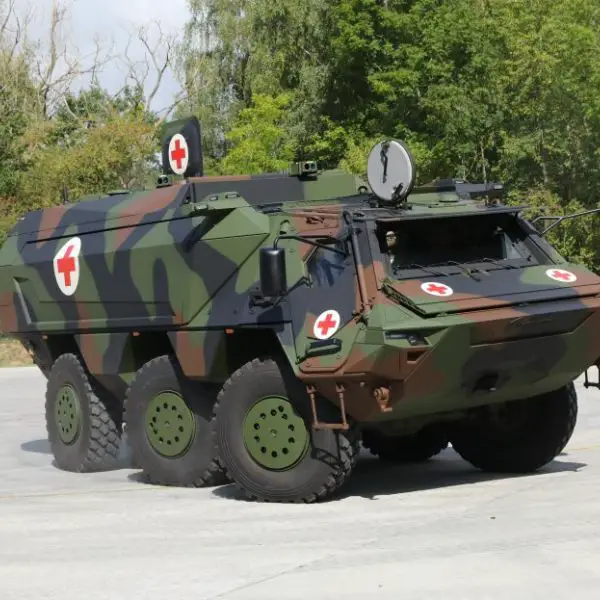 Rheinmetall presents the new version of the Fuchs/Fox wheeled armoured transport vehicle as a high-roof demonstrator to an international trade audi...