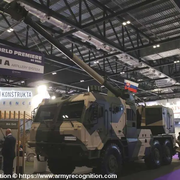 At the DSEI 2023 exhibition in London, the Slovakian society Konstrukta Defence unveils the prototype of a new 6x6 155mm self-propelled howitzer na...