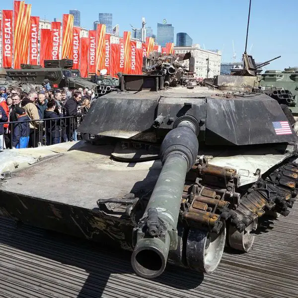 Captured US Abrams M1A1 Tank of Ukrainian Army Displayed by Russia at Victory Day Park Near Moscow