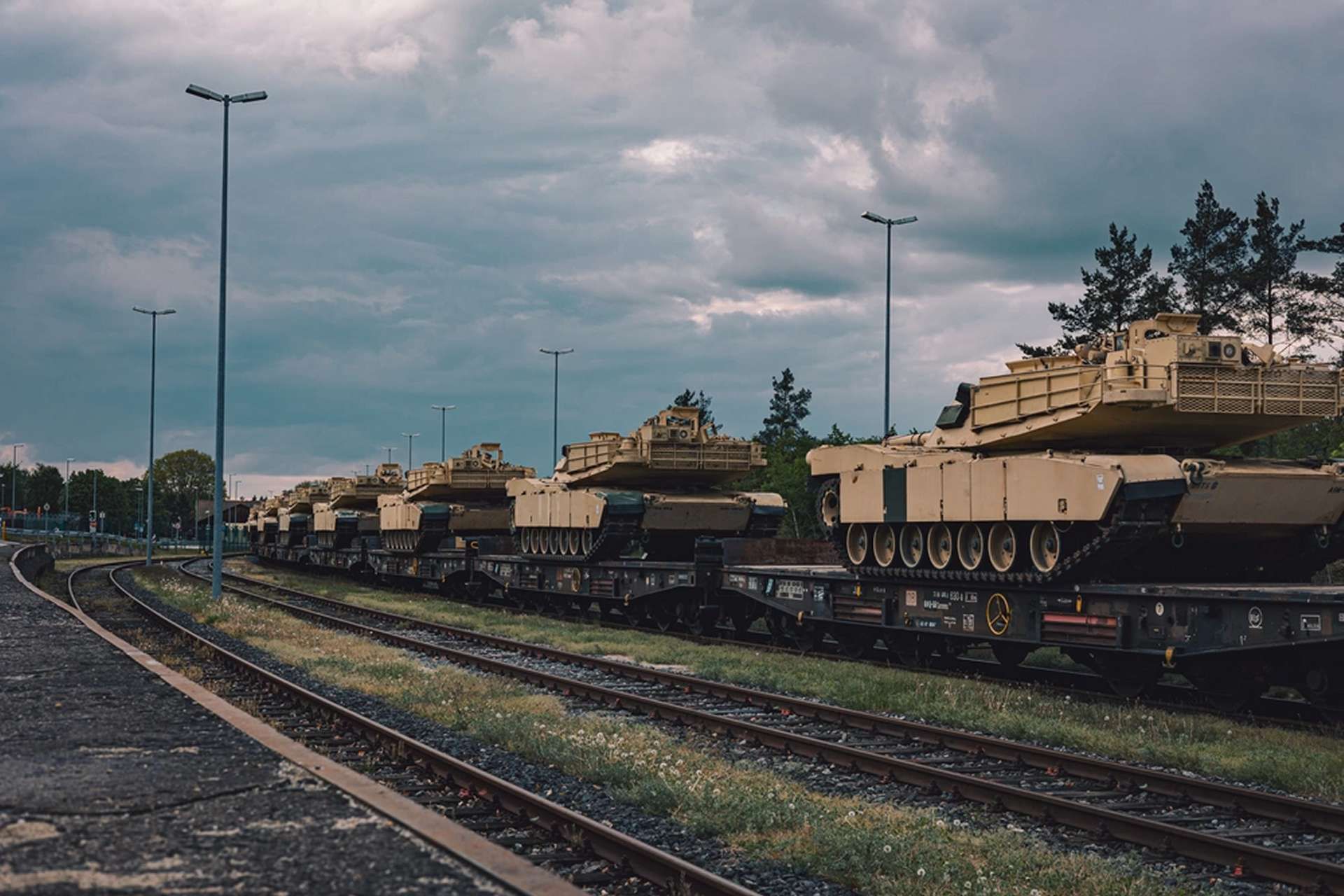 US M1A1 Abrams tanks needed for training the Armed Forces of Ukraine arrive by rail at Grafenwoehr, Germany. ( Picture Source: US DoD)