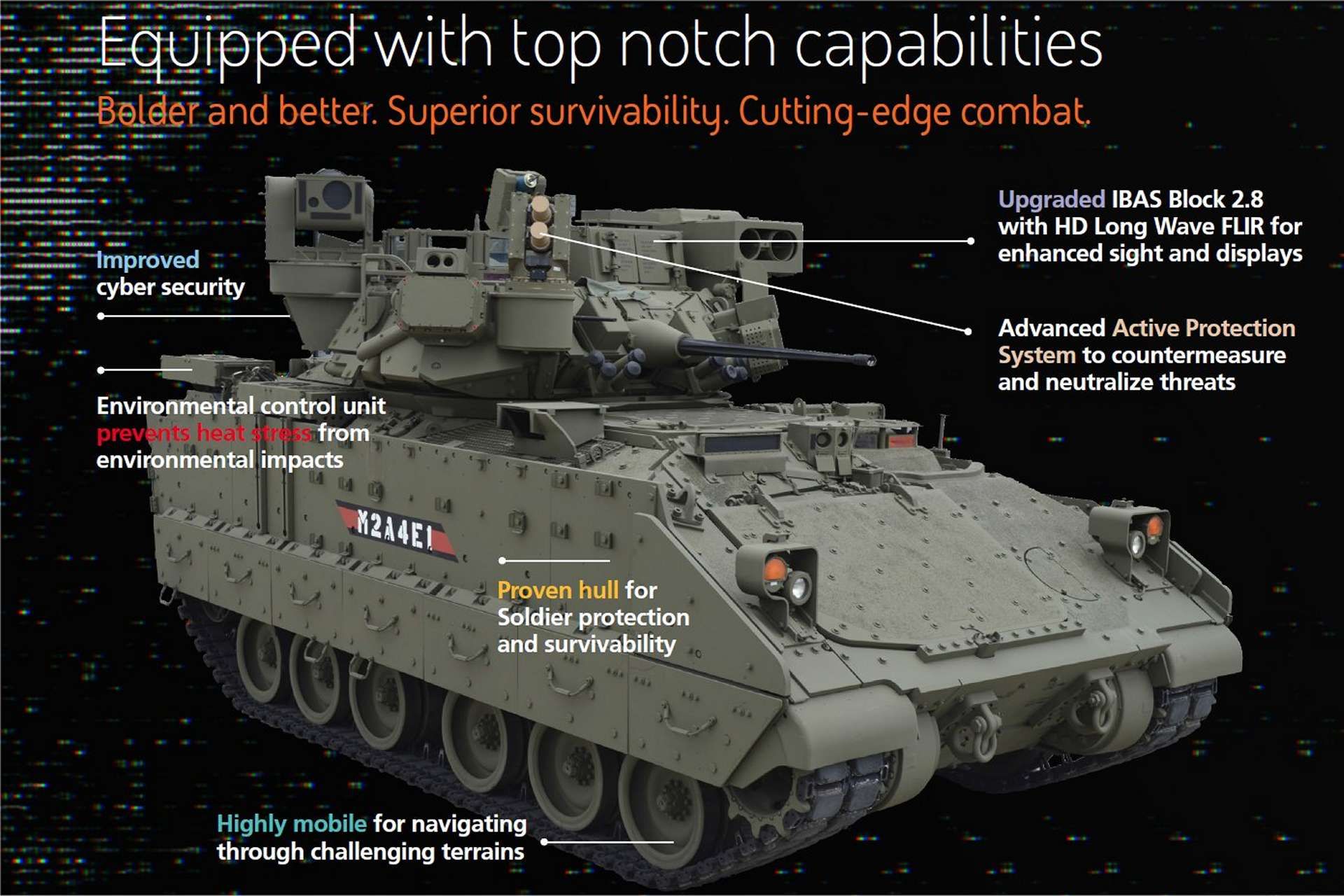 The chassis of the M2A4E1 remains true to its reputation for robustness and soldier protection, but it benefits from several upgrades to increase mobility in difficult terrains, while also offering improved protection against mines and improvised explosive devices (IEDs). The vehicle is equipped with an environmental control system, designed to prevent crew heat stress in extreme climatic conditions, ensuring better operational endurance.