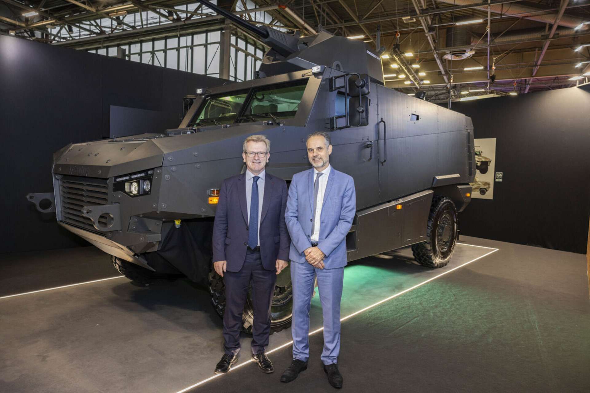 Emmanuel Levacher (Arquus) and Thierry Renaudin (John Cockerill Defense) in front of Arquus' new vehicle MAV'RX equipped with a Cockerill CPWS turret. (Picture source: John Cockerill)