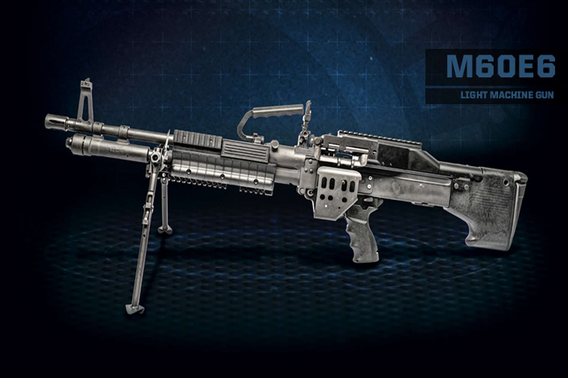 The M60-E6, an evolution of the M60 series, is a lightweight and enhanced weapon designed for optimal maneuverability and reliability in combat. This 9.27 kg model operates with a gas system and fires 7.62x51 mm NATO caliber ammunition from a disintegrating belt. Equipped with a 558 mm barrel, it can achieve a firing rate of 550 rounds per minute, with an effective range of 1,200 meters and a maximum range of 3,725 meters under ideal conditions.