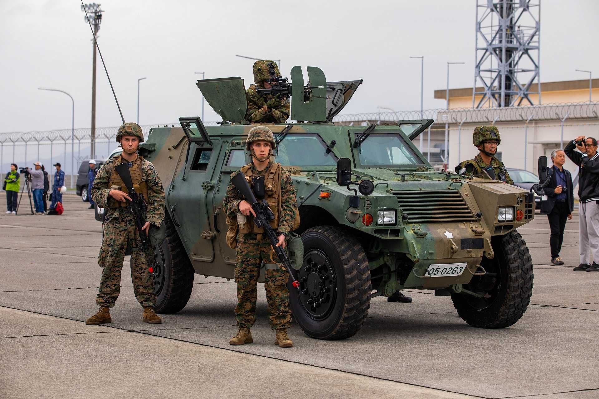U.S. Marines from the Headquarters Squadron, Marine Corps Air Station Iwakuni, and members of the Japan Ground Self-Defense Force’s 13th Brigade, Middle Army, provide security using a Komatsu Light Armored Vehicle at MCAS Iwakuni, Japan, on October 29, 2024, during Exercise Keen Sword. (Picture source: U.S. DoD)