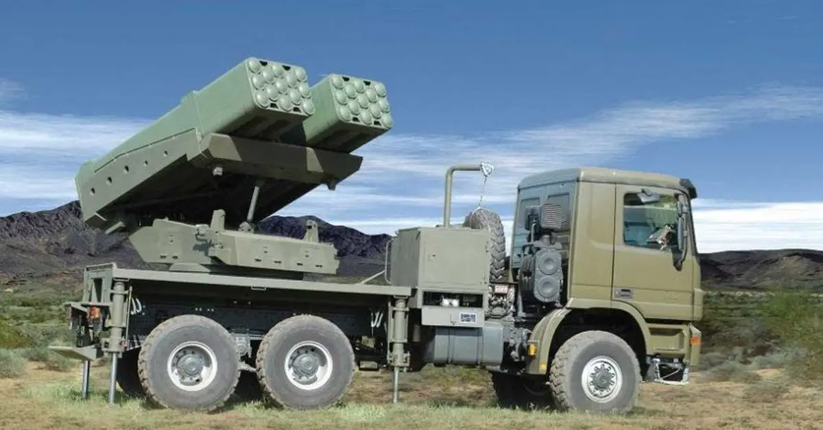 The missile configurations include 18 Accular 122mm missiles with a range of up to 35 kilometers, 10 Accular 160mm missiles reaching 40 kilometers, 4 EXTRA missiles with a range of 150 kilometers, and 2 Predator Hawk missiles capable of 300 kilometers. The system also has the capability to launch the SkyStriker loitering munition, which has a range exceeding 100 kilometers, can be recovered if unused, and is deployable for reconnaissance and strike operations.
