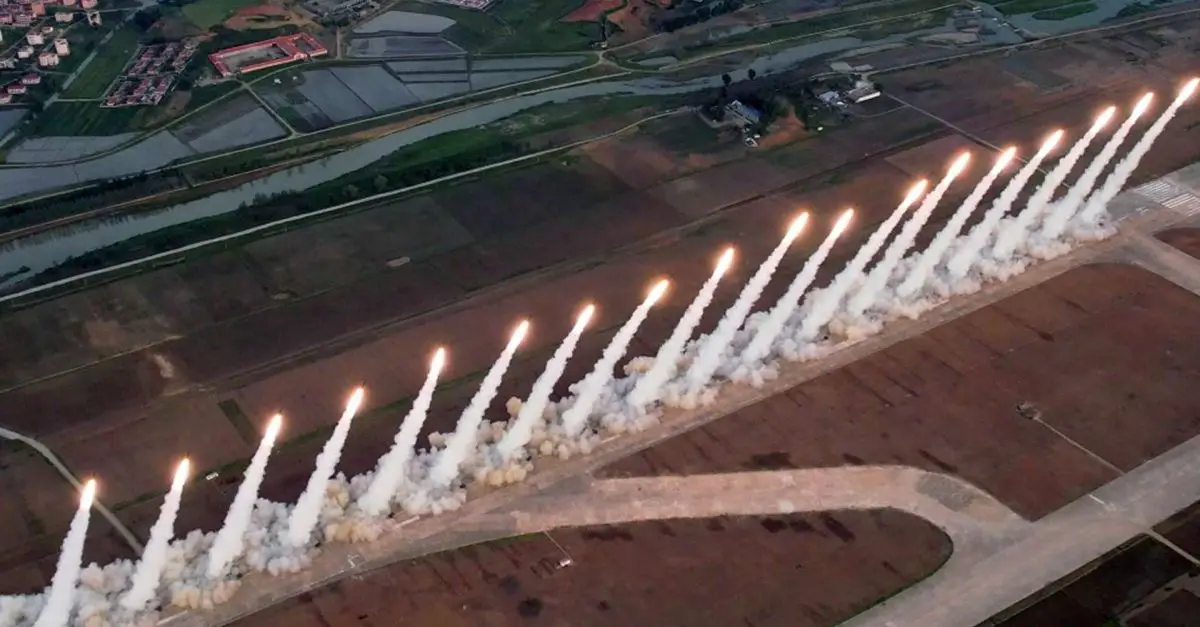 North Korea's KN-25 600mm rocket/missile launcher system in action during a test fire, showcasing its formidable power and advanced capabilities. (Picture source: KCNA)