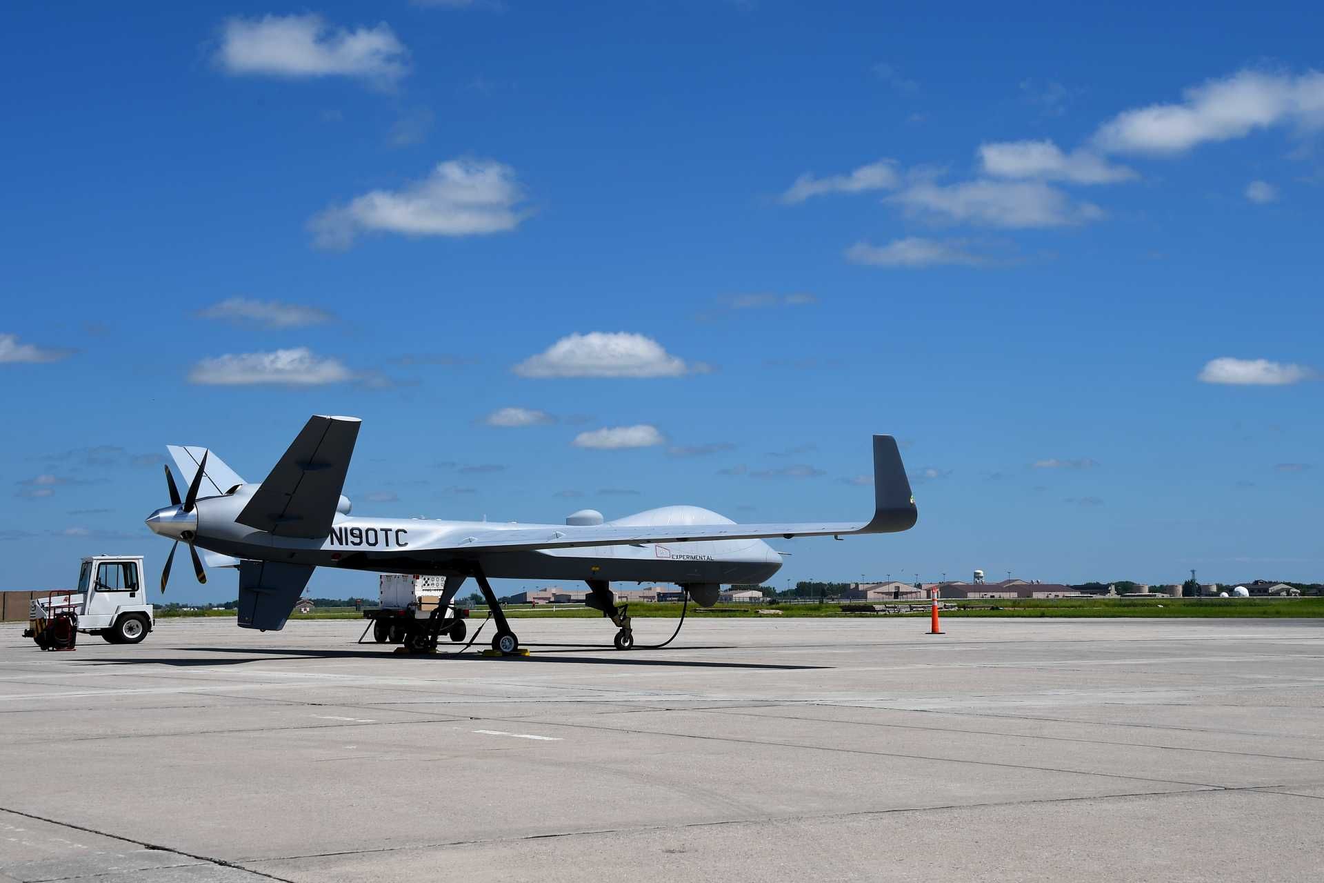 An MQ-9B SkyGuardian prepares to taxi from Grand Forks Air Force Base, North Dakota, to Gloucestershire, England(Picture source: U.S. DoD)