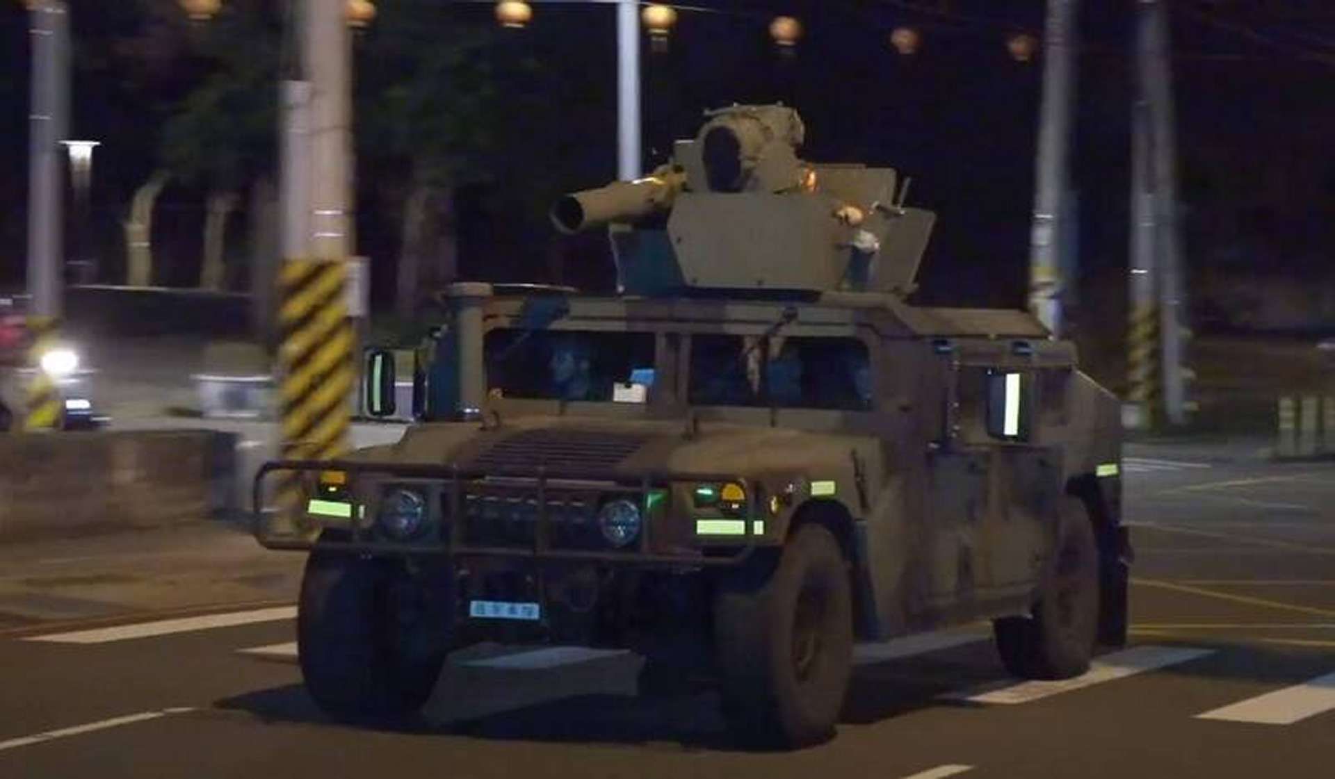 Taiwan's 586th Brigade deploys US-supplied M1167 TOW missile carriers in 2024 Han Kuang exercise.