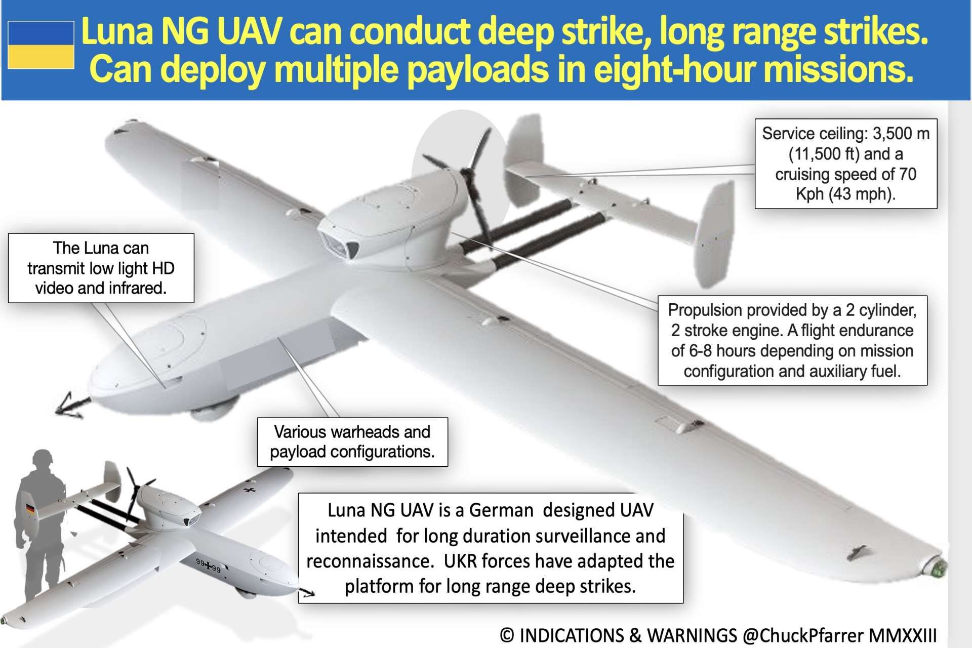 Chuck Pfarrer, a notable defense analyst and former Navy SEAL, shared information about the attack via his Twitter account, @ChuckPfarrer. He referenced a video posted by Anton Gerashchenko (@Gerashchenko_en), an advisor to the Ukrainian Ministry of Internal Affairs, which provides a closer look at the strike. According to Pfarrer, the drone used in this operation appears to be an adaptation of the long-range reconnaissance drone Luna NG, capable of sustaining flight for eight hours. This suggests an advancement in Ukrainian drone technology, enabling deeper and more precise strikes into Russian territory.