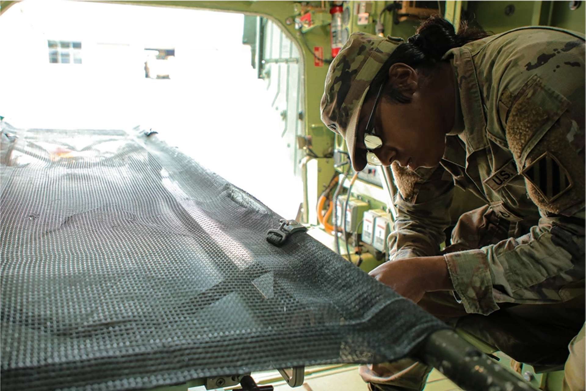 A combat medic secures a litter in an Armored Multi-Purpose Vehicles (AMPV). ( Picture Source: US DoD)
