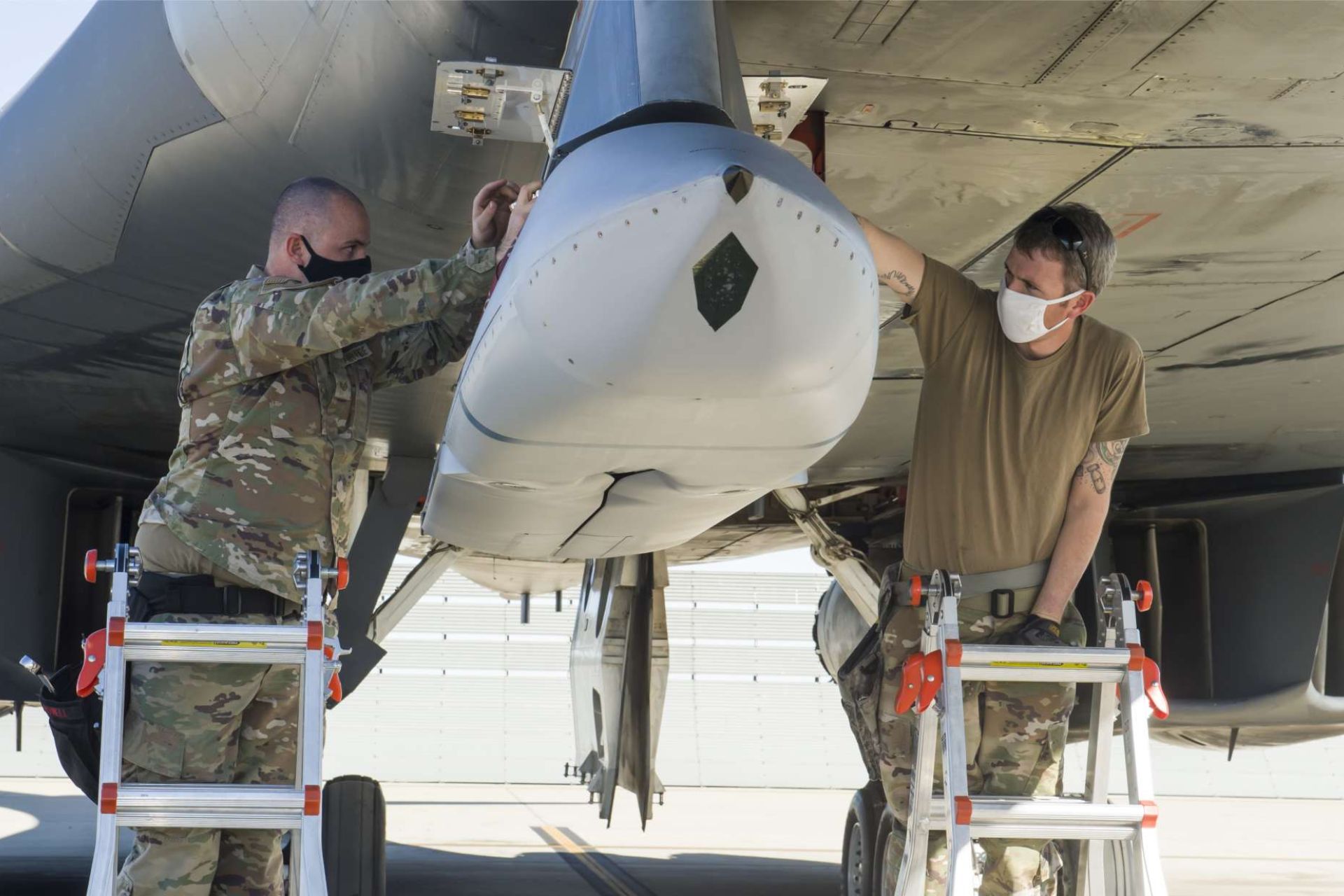 A weapon Loader crew uploads a Joint Air-to-Surface Standoff Missile to an external pylon on a B-1B Lancer at Edwards Air Force Base. (Picture source: U.S. DoD)