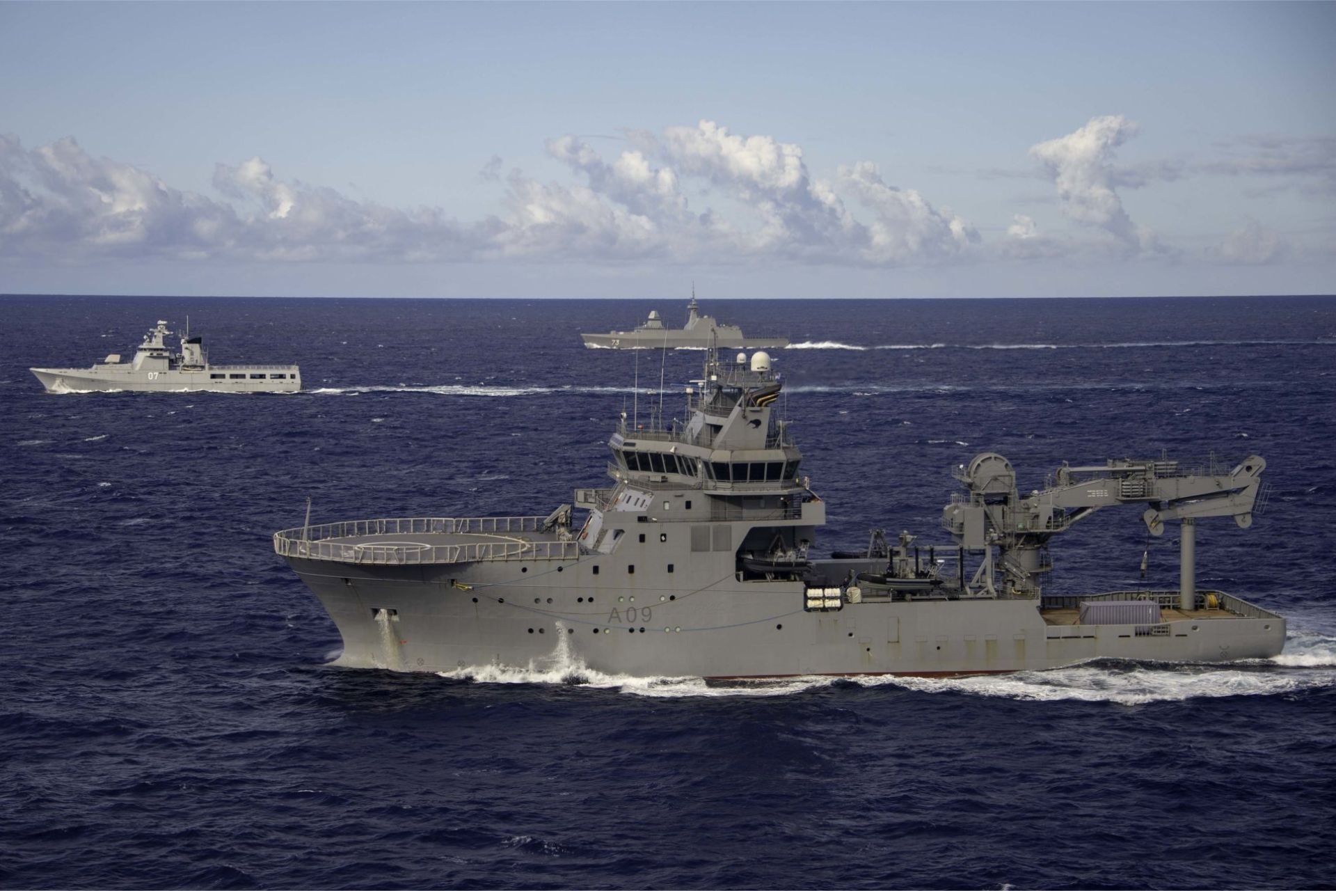The multi-role offshore support vessel HMNZS Manawanui sailed in formation alongside other ships during Exercise RIMPAC 2020. (Picture source: Dvids)