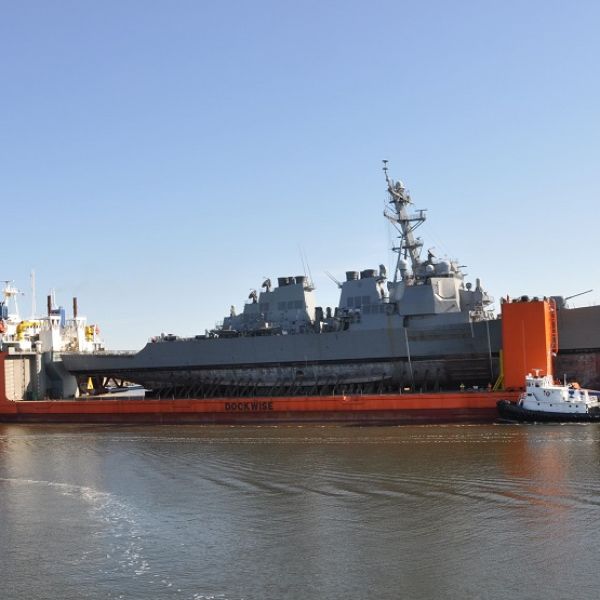 The Arleigh Burke-class guided missile destroyer USS Fitzgerald (DDG 62) arrived in Pascagoula, Mississippi, Jan. 19, aboard heavy lift vessel MV T...