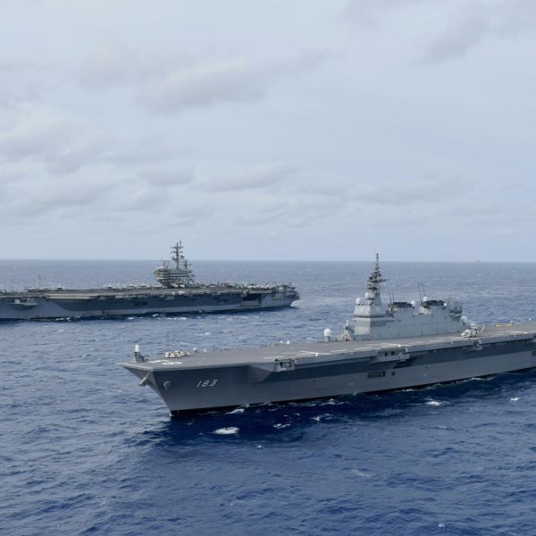 USS Ronald Reagan and JS Izumo sail together in the South China Sea