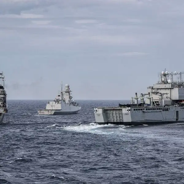 British Navy HMS Albion and RFA Lyme Bay ships train with Italian Navy ITS Giuseppe Garibaldi aircraft carrier