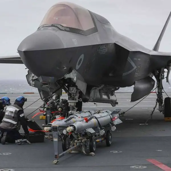 F-35B jets embarked on British Navy HMS Queen Elizabeth aircraft carrier conduct live weapons training
