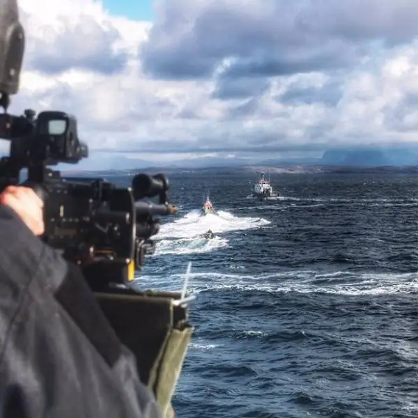 British Navy HMS Sutherland frigate conducts simulated small boat attack exercises SWARMEX