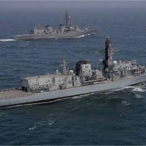 British Navy HMS Argyll Type 23 Duke-class frigate conducts naval training with Japanese Navy in the Gulf of Aden