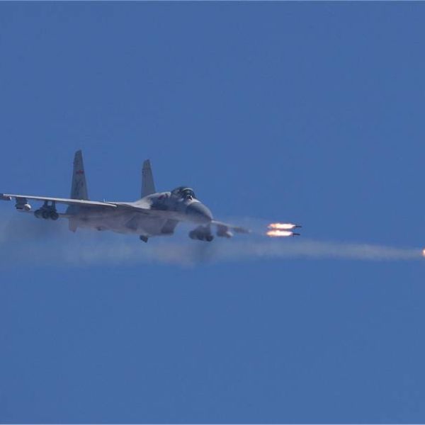 J-15 fighter of Chinese Navy aircraft carrier Liaoning conduct live firing and refueling training exercises