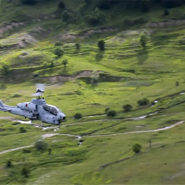 Live firing training exercise for US Marines Corps UH-1Y Venom and AH-1W Super Cobra helicopters in Albania