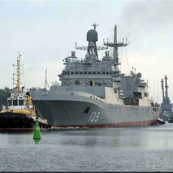 Russian Navy Petr Morgunov Ivan Gren Class landing ship conducts live firing exercise at sea