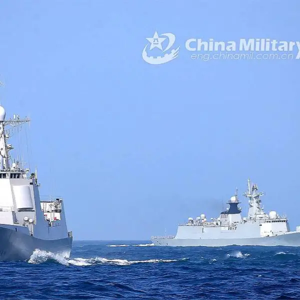 Guided missile destroyer Jinan and frigate Changzhou of Chinese Navy conduct naval exercise in the East China Sea